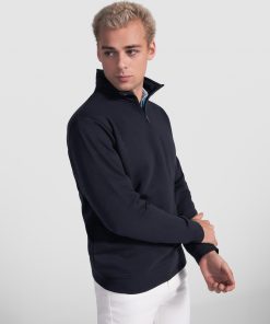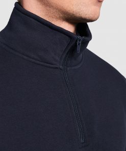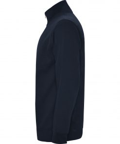 Sudadera unisex media cremallera y cuello alto. Cremallera al tono. Puños y cinturilla en canalé 2×1 con elastano. Cubrecosturas del mismo tejido.