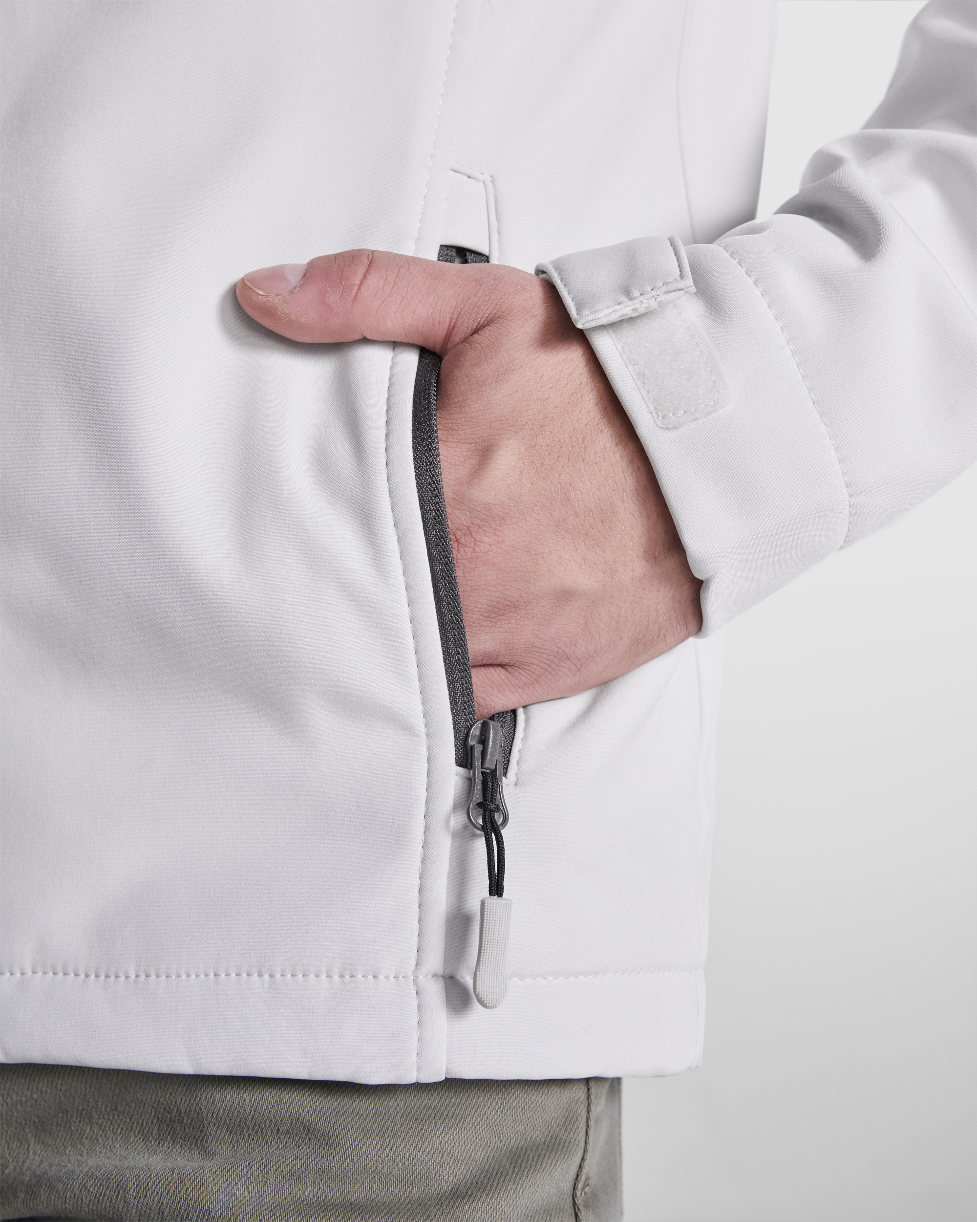 Chaqueta softshell de 2 capas con cremallera frontal invertida a contraste. Interior en tejido micropolar. Dos bolsillos laterales y uno en pecho izquierdo con cremalleras invertidas a contraste. Protector de barbilla del mismo tejido invertido. Ajustadores laterales en el interior en tallas de adulto.