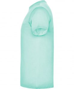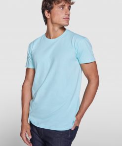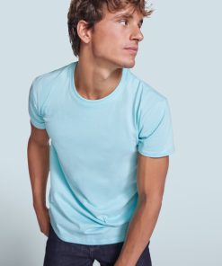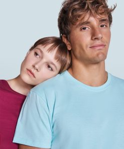 Camiseta de manga corta tubular en tallas de adulto y costuras laterales en tallas de niño. Cuello redondo en canalé 1×1. Cubrecosturas en cuello del mismo tejido.