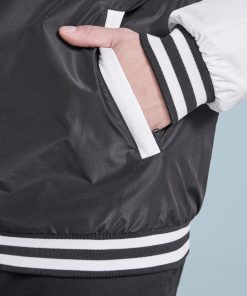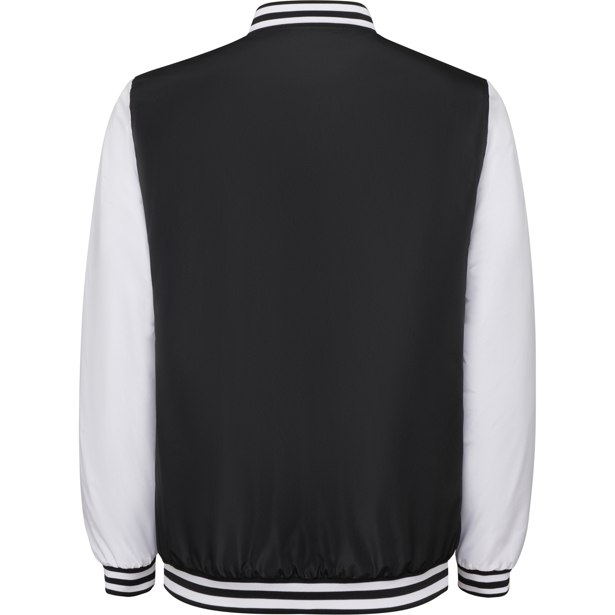 Chaqueta unisex combinada a dos colores. Ligeramente acolchada. Bolsillos laterales con cremallera y ribete del mismo tejido a contraste. Cuello, puños y bajo en canalé 1×1 con líneas a contraste combinado con el cuerpo. Botones a presión con acabado en plástico a contraste. Acceso para reprocesos en la espalda.