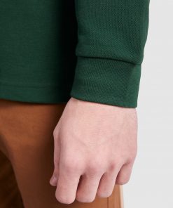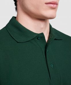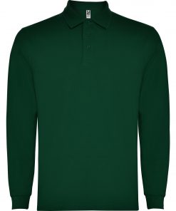 Polo de manga larga. Punto piqué. Cuello y puños tejidos 1×1. Tapeta de 3 botones. Cubrecosturas en cuello del mismo tejido. Aperturas laterales en bajo. Bolsillo opcional.