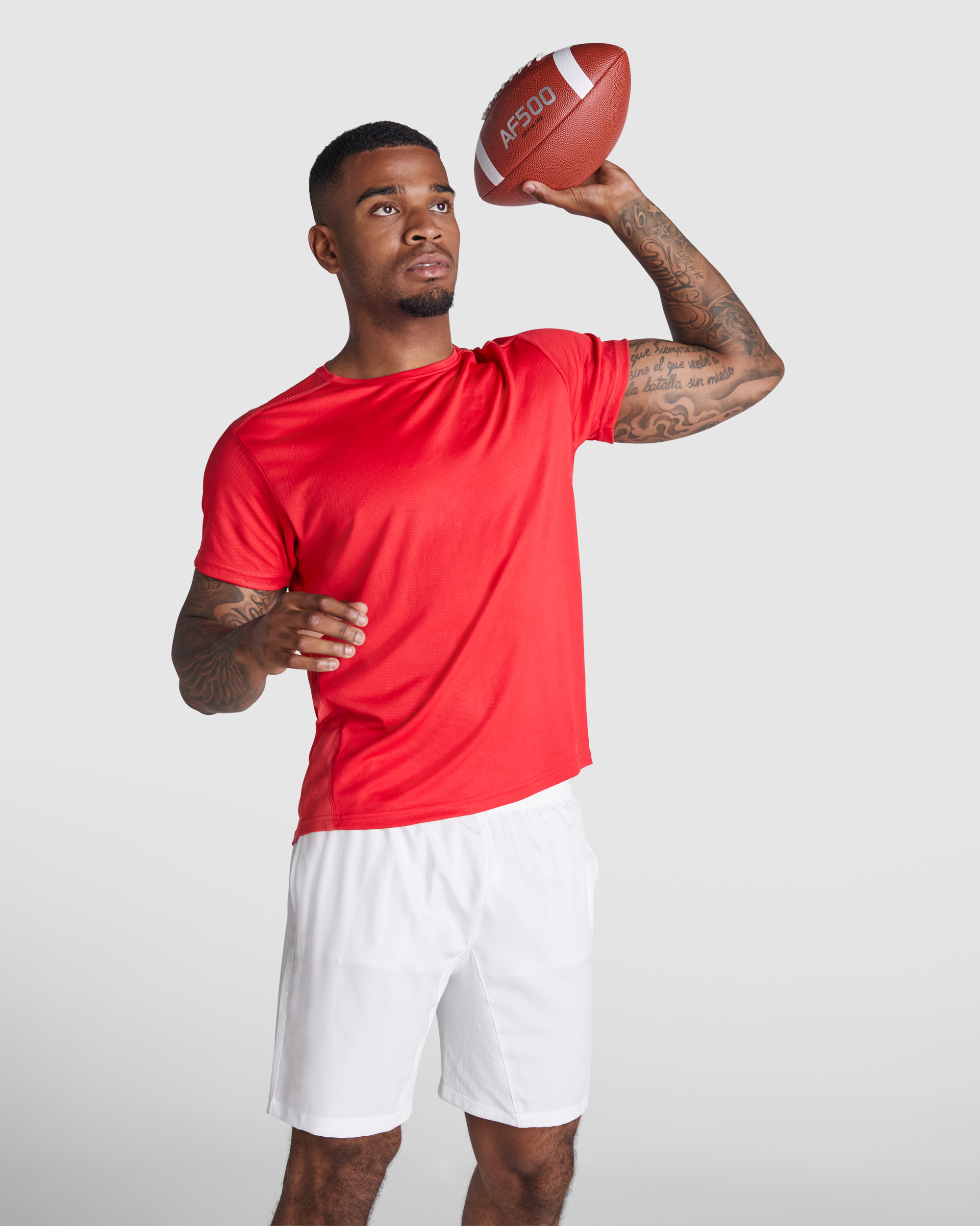 Camiseta técnica manga corta unisex transpirable bicolor. Combinación de tejidos y color. Cuello redondo y cubrecosturas del tejido principal. Costuras remalladas a contraste.