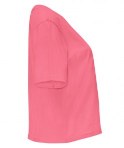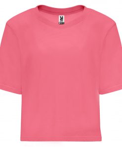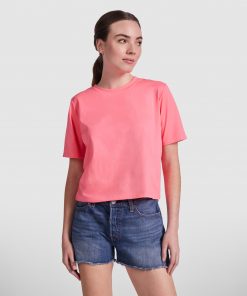 Camiseta manga corta con talle corto y holgado. Cuello redondo en canalé 1×1 ancho. Cubrecosturas en cuello del mismo tejido.