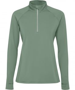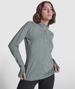 Sudadera técnica perchada manga ranglan entallada y media cremallera invertida con detalle reflectante. Cubrecosturas en cuello interno. Puños con ojal para pulgar. Detalles reflectantes en la espalda. Faldón trasero. Certificado GRS.