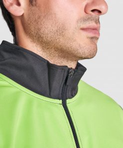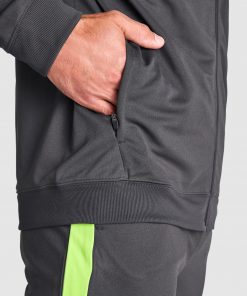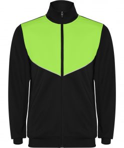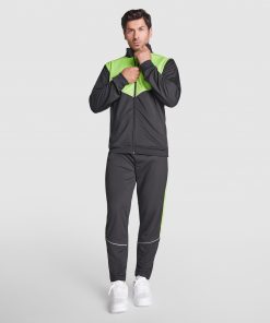 Chándal tejido ligero no perchado. Chaqueta de cuello alto y cubrecosturas a contraste. Piezas a contraste de color en pecho y vivo. Cremallera frontal. Bolsillos laterales con cremallera. Cuello, puños y cintura en canalé de 2×2. Pantalón corte pitillo con cintura elástica y cordón ajustable. Pieza lateral a contraste de color y cremalleras en los tobillos con tapeta.