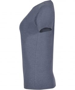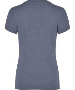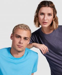 Camiseta de manga corta ligeramente entallada en cintura. Cuello redondo en canalé 1×1. Cubrecosturas en cuello del mismo tejido.