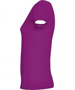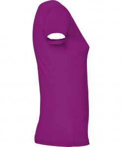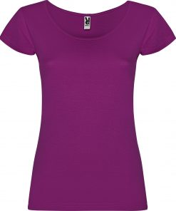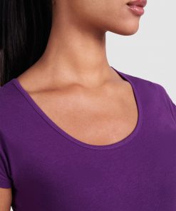 Camiseta de manga corta entallada en cintura. Cuello con amplio escote redondo con ribete al tono del mismo tejido.