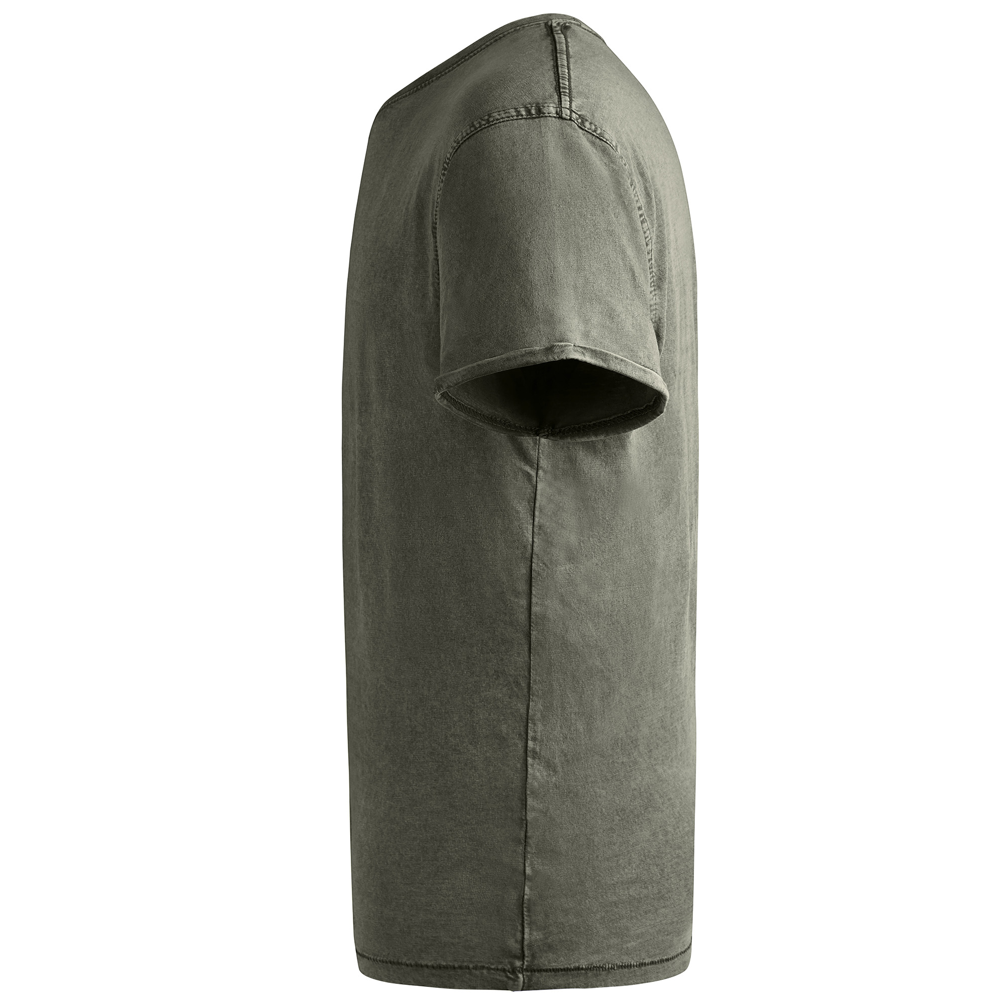 Camiseta de manga corta con costuras laterales efecto lavado. Algodón peinado. Cuello redondo en canalé 1×1. Cubrecosturas en cuello del mismo tejido. Costuras dobles en laterales y sisas. Costuras decorativas en mangas y bajo y detalle de costuras de refuerzo en dobladillos.