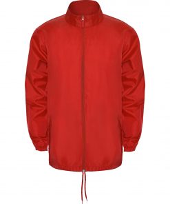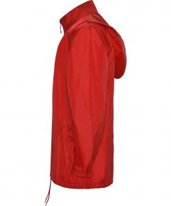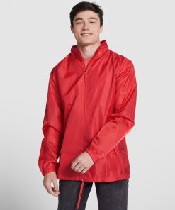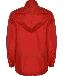 Chubasquero con cuello alto y capucha extraíble con cordón ajustable. Cremallera frontal al tono. Bolsillos laterales con cremallera cubiertos por solapa del mismo tejido. Puños elásticos. Bajo con cordón interno ajustable. Goma en bolsillo para su plegado.
