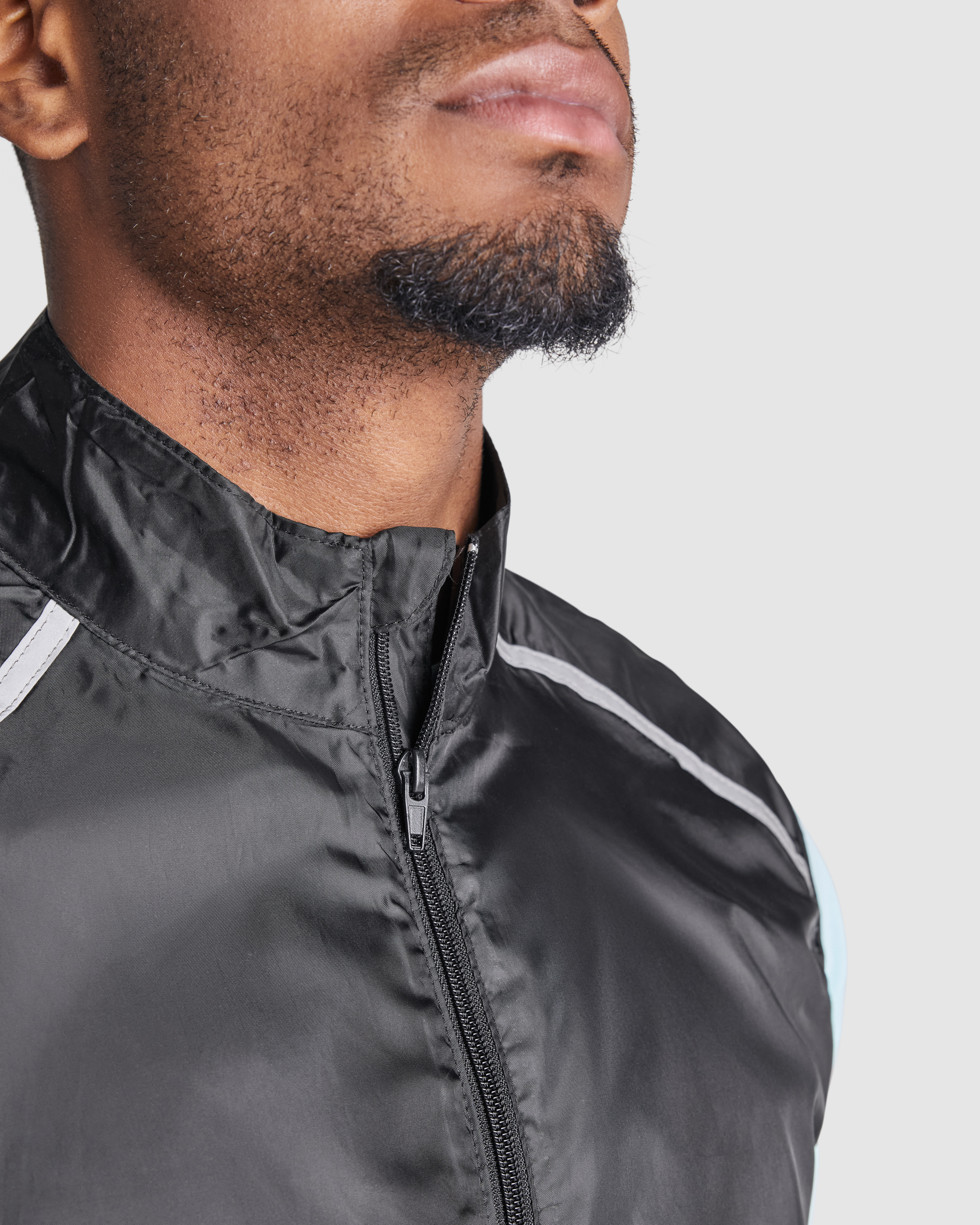 Chaleco cortavientos ultraligero. Cremallera frontal al tono. Protector de barbilla. Espalda en tejido de malla transpirable. Bandas reflectantes en el frontal y en espalda de los hombros como puntos de visibilidad aumentada. Sisas y bajo con ribete elástico al tono. Bolsillo lateral izquierdo para plegado.