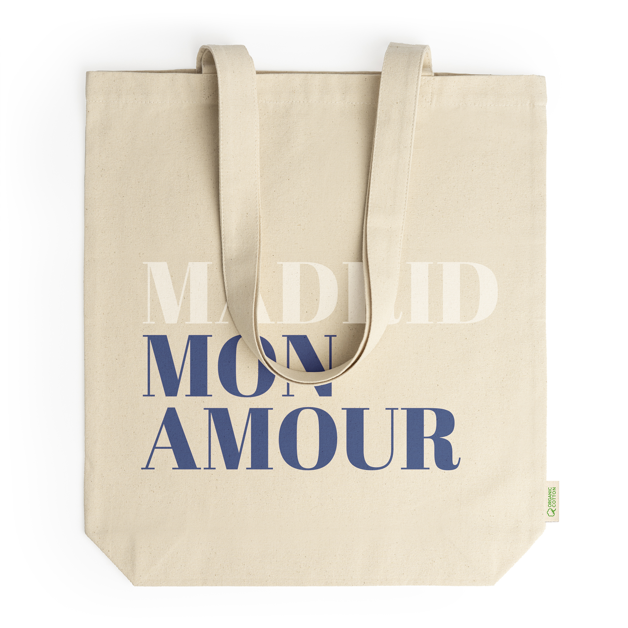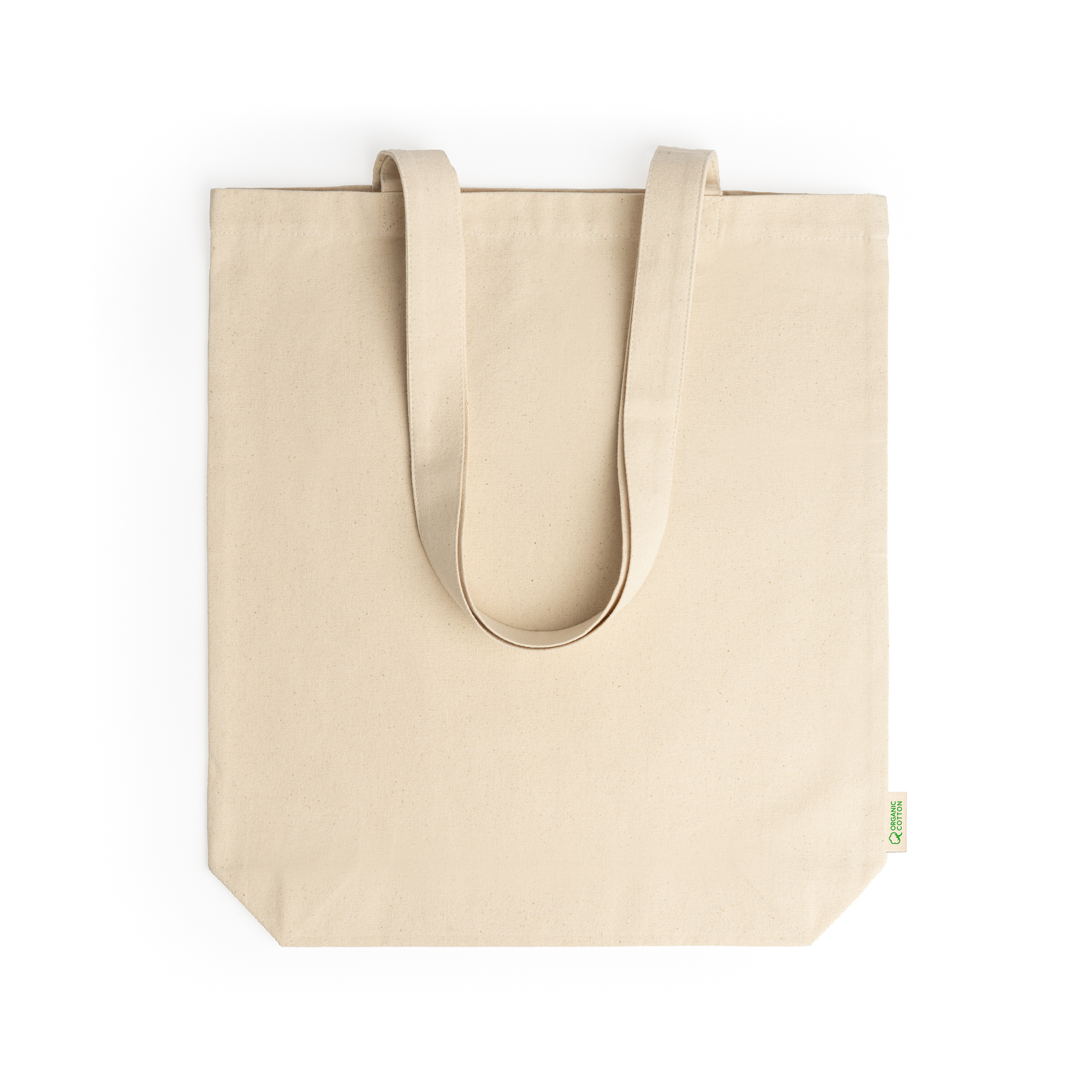 Bolsa 100% algodón orgánico de 280 g/m² con fuelle para mayor adaptabilidad y versatilidad. Incorpora prácticas asas largas de 70cm para convertirla en una opción cómoda en sus transporte.
