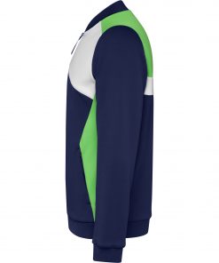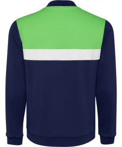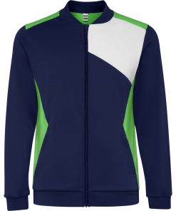 Chaqueta deportiva con cremallera frontal perchada. Bolsillos laterales con cremallera. Piezas a contraste de color, una blanca en pecho especial para bordados. Cuello, puños y cintura en canalé de 1×1.