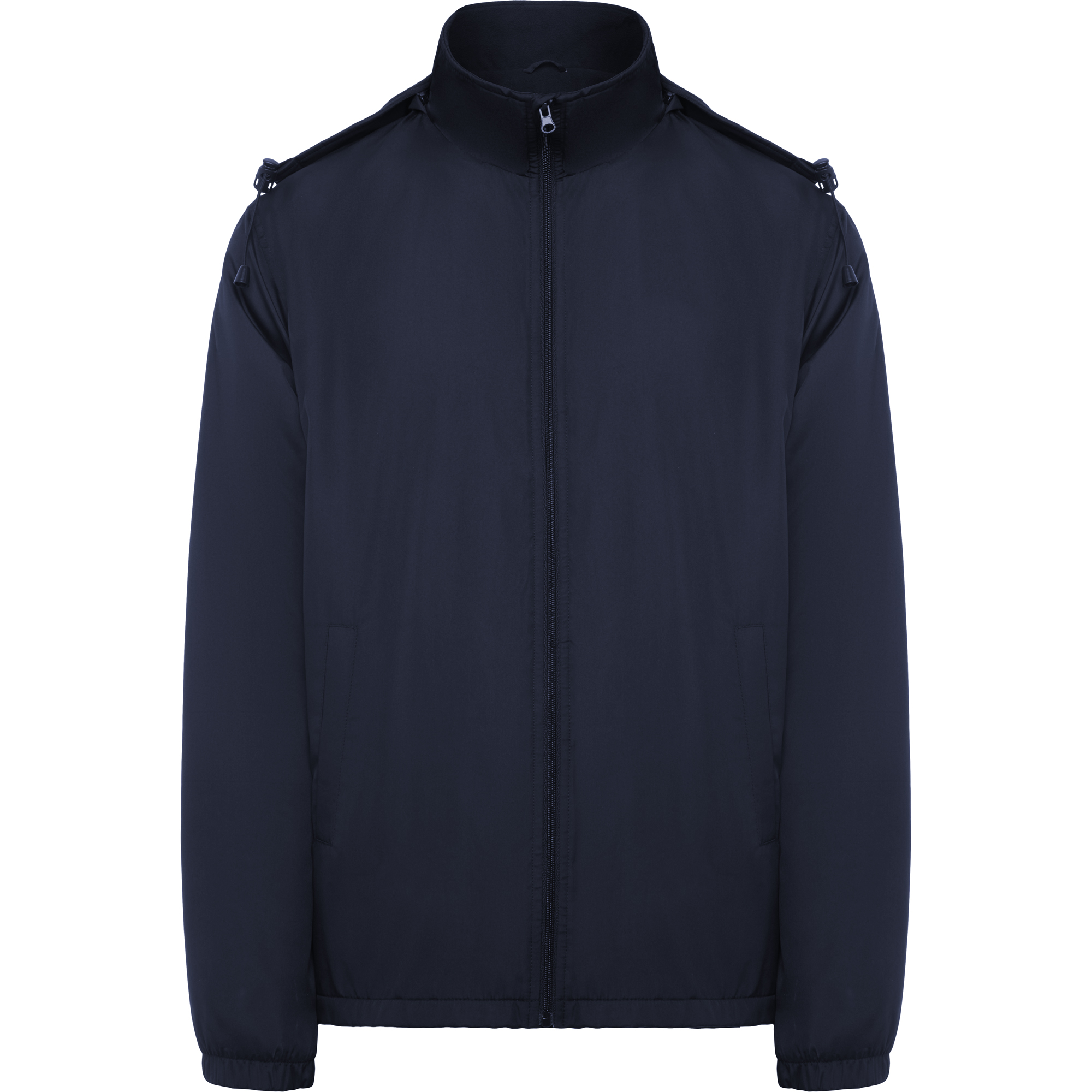 Chaqueta ligera resistente al agua con cremallera frontal. Protector de barbilla. Capucha con cremallera extraíble y ajustadores elásticos. Puños engomados. Bolsillos laterales con cremallera y ribeteados en el mismo tejido. Bolsillo interior en pecho izquierdo. Forro interior en micropolar al tono.