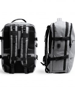 Mochila de viaje realziada en poliéster reciclado RPET, diseñada para comodidad y funcionalidad. Cuenta con espalda y asas acolchadas, 2 bolsillos exteriores frontales y 3 amplios compartimentos principales. Incluye un compartimento acolchado para portátil de 17,3″, salida USB con cable micro USB para conectar un Power Bank (no incluido), y un compartimento transpirable para zapatillas. Con bolsillo antirrobo en la parte trasera y cinta para trolley, ofrece una capacidad de 30 litros para viajes organizados y seguros.