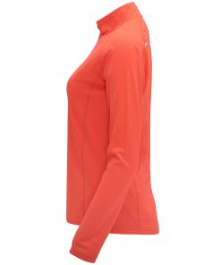 Sudadera técnica de manga larga ranglán para mujer con interior perchado. Cubrecosturas de refuerzo a contraste en el interior del cuello. Media cremallera invertida a tono con detalle reflectante. Puños con apertura para pulgar. El patronaje de la espalda es ligeramente más largo que el delantero. Detalles reflectantes en las espalda.