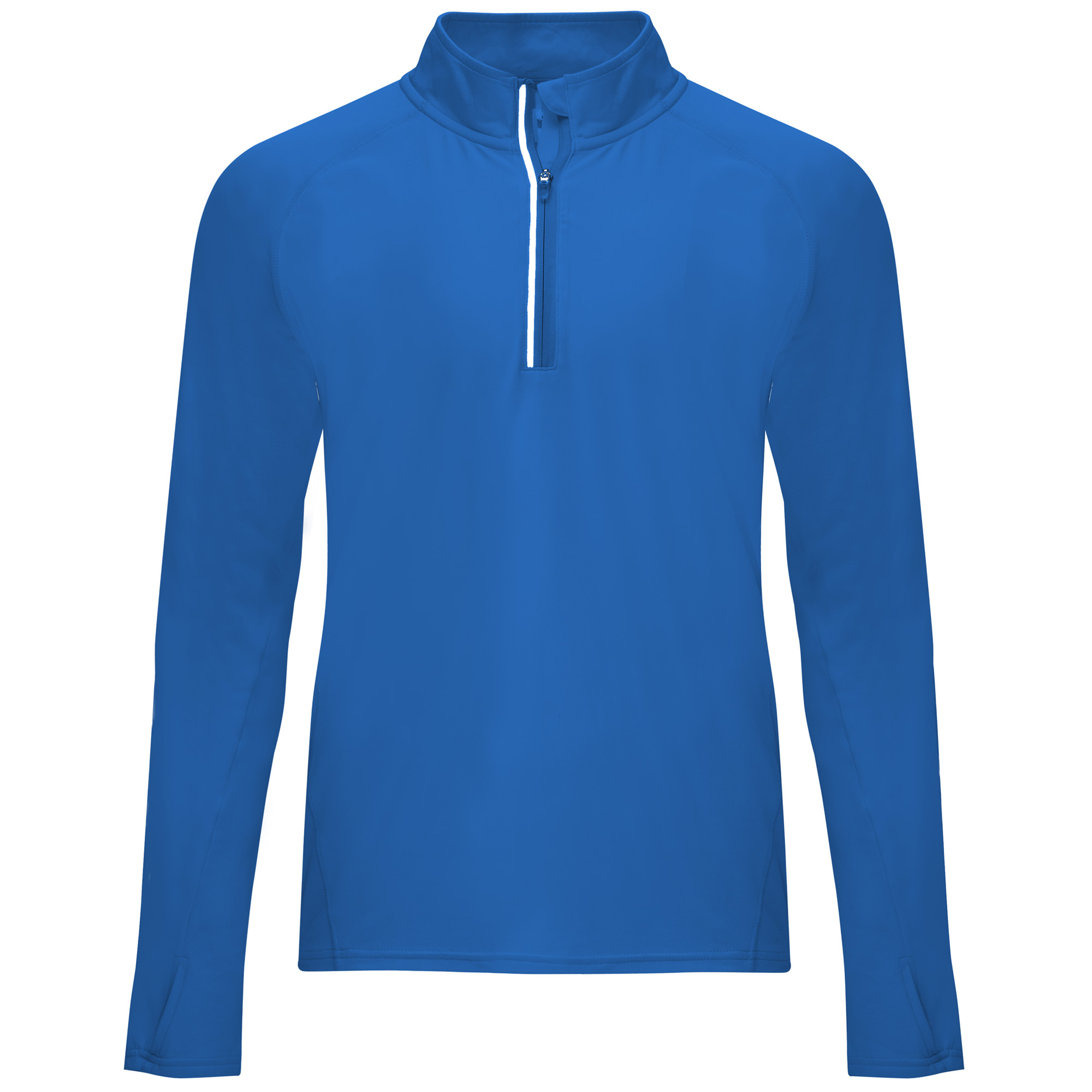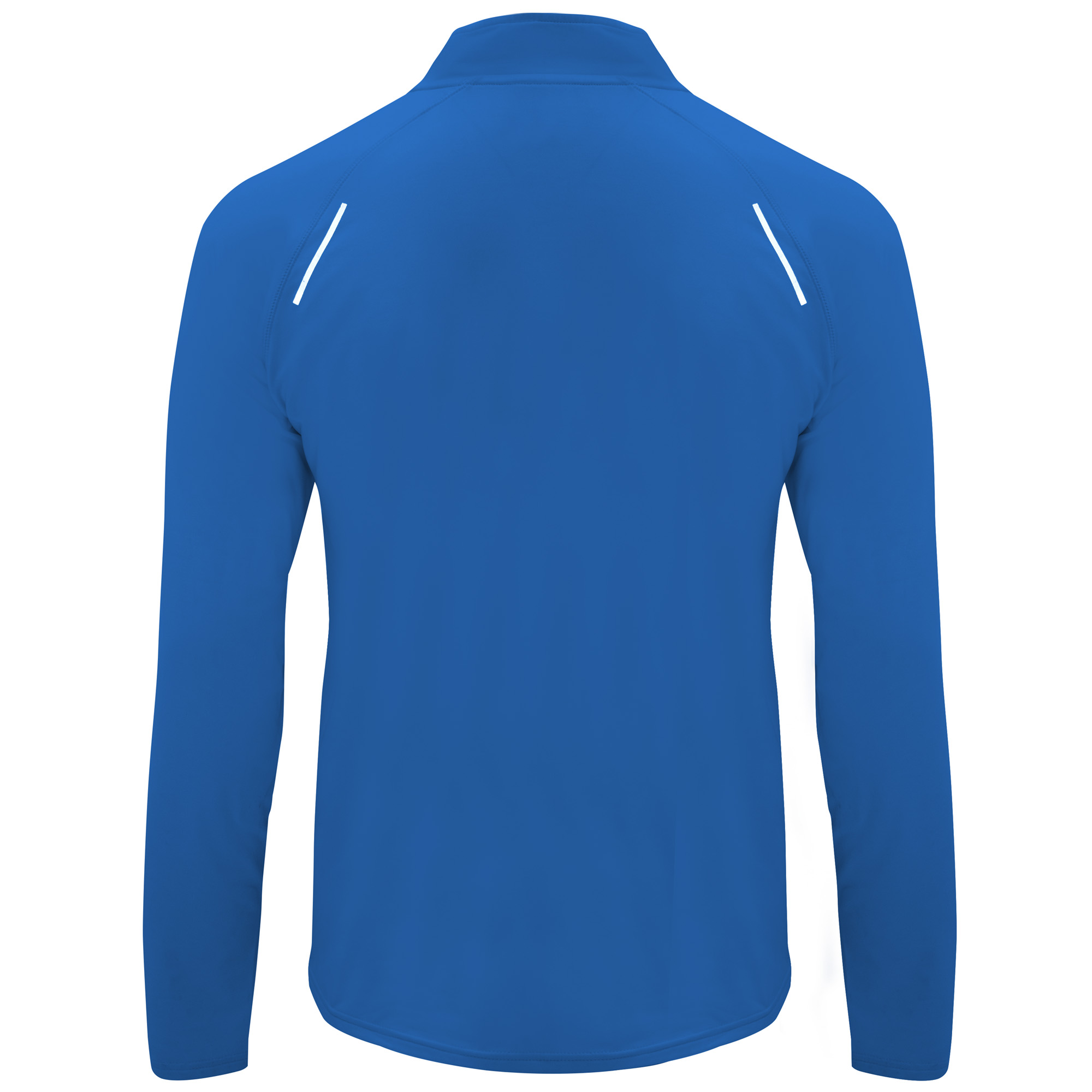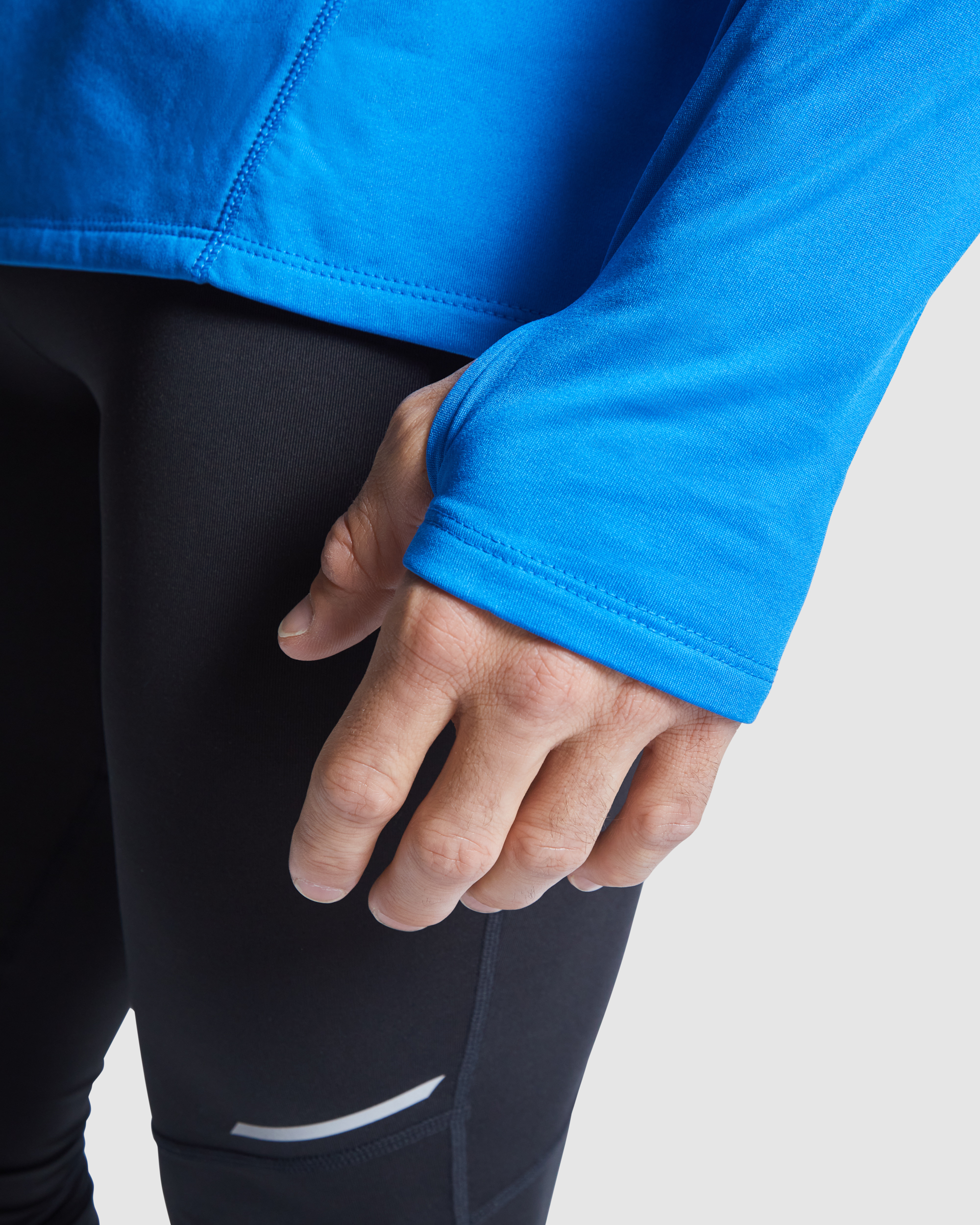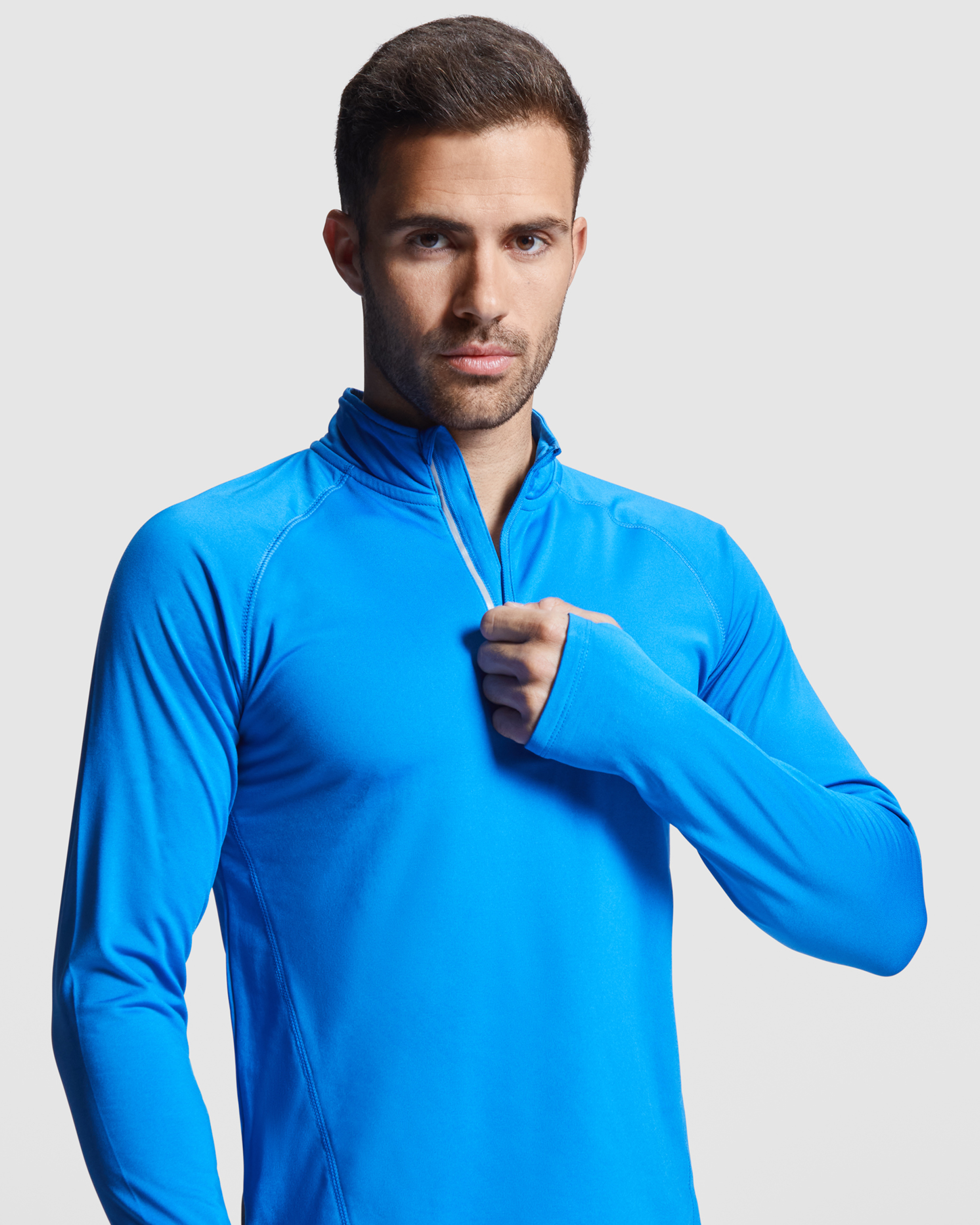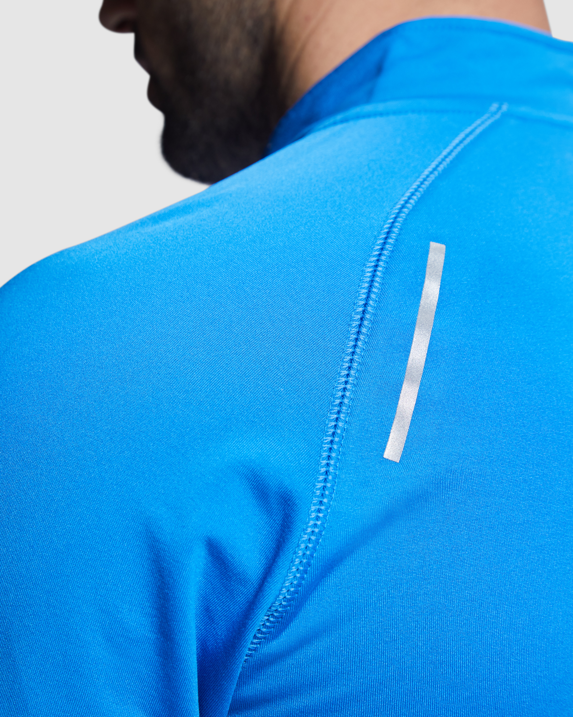 Sudadera técnica de manga larga ranglán para hombre con interior perchado. Cubrecosturas de refuerzo a contraste en el interior del cuello. Media cremallera invertida a tono con detalle reflectante. Puños con apertura para pulgar. El patronaje de la espalda es ligeramente más largo que el delantero. Detalles reflectantes en las espalda.