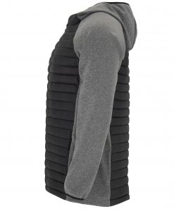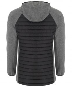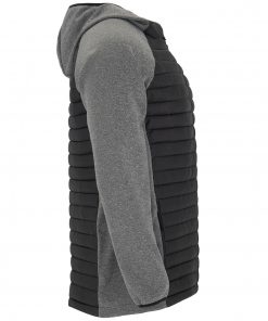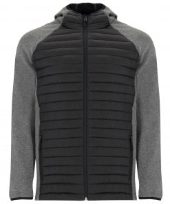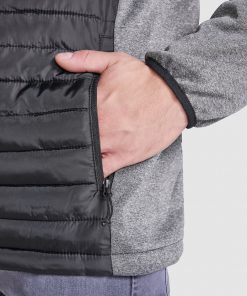 Chaqueta de manga ranglan y capucha combinada con dos tejidos: el cuerpo delantero y espalda en tafetán ligeramente acolchado, y las mangas, capucha y paneles laterales en poliéster con el interior en micropolar. Bolsillos laterales con cremalleras al tono insertados en los paneles laterales. Vivo elástico en contorno de capucha y puños. Espalda con faldón.
