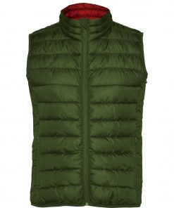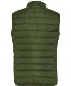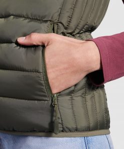 Chaleco acolchado resistente al agua. Cremallera frontal invertida al tono con protector de barbilla del mismo tejido. Bolsillos laterales con cremalleras invertidas al tono insertado en los paneles laterales con forma en pecho para mejor ajuste. Vivo elástico al tono en sisas y bajo. Opción de colores lisos o a contraste en interior.