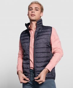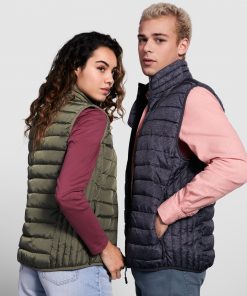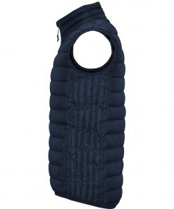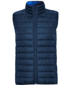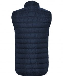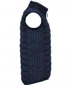 Chaleco acolchado resistente al agua. Cremallera frontal invertida al tono con protector de barbilla del mismo tejido. Bolsillos laterales con cremalleras invertidas al tono insertado en los paneles laterales. Vivo elástico al tono en sisas y bajo. Opción de colores lisos o a contraste en interior.