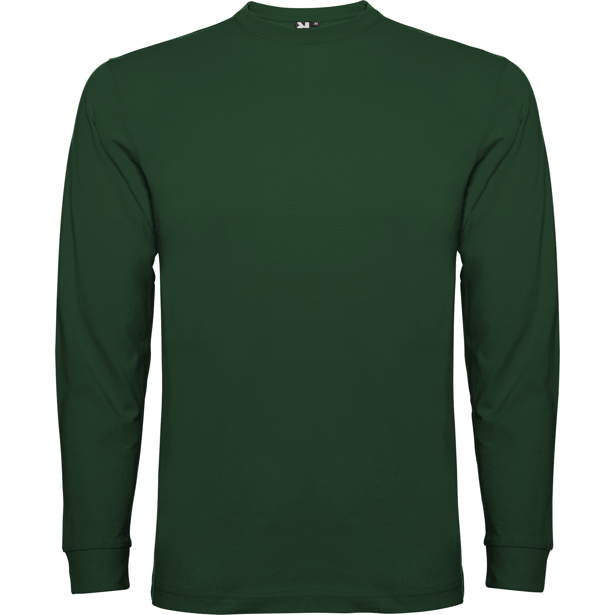 Camiseta de manga larga tubular en tallas de adulto y costuras laterales en tallas de niño. Cuello redondo y puños en canalé 1×1 (cuello 4 capas). Cubrecosturas en cuello del mismo tejido.