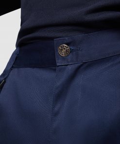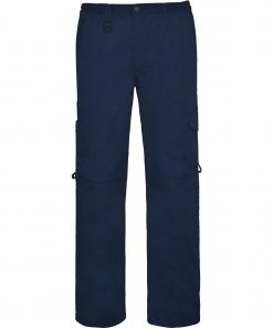 Pantalón largo multibolsillos con botón metálico personalizado.