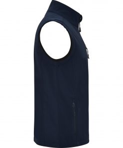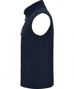 Chaleco softshell de 2 capas con cremallera frontal invertida. Interior en tejido micropolar. Dos bolsillos laterales y uno en pecho derecho con cremalleras invertidas. Protector de barbilla del mismo tejido invertido. Ajustadores laterales en el interior.