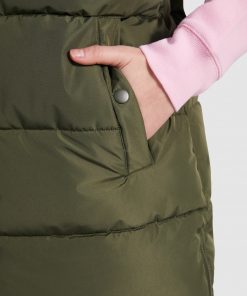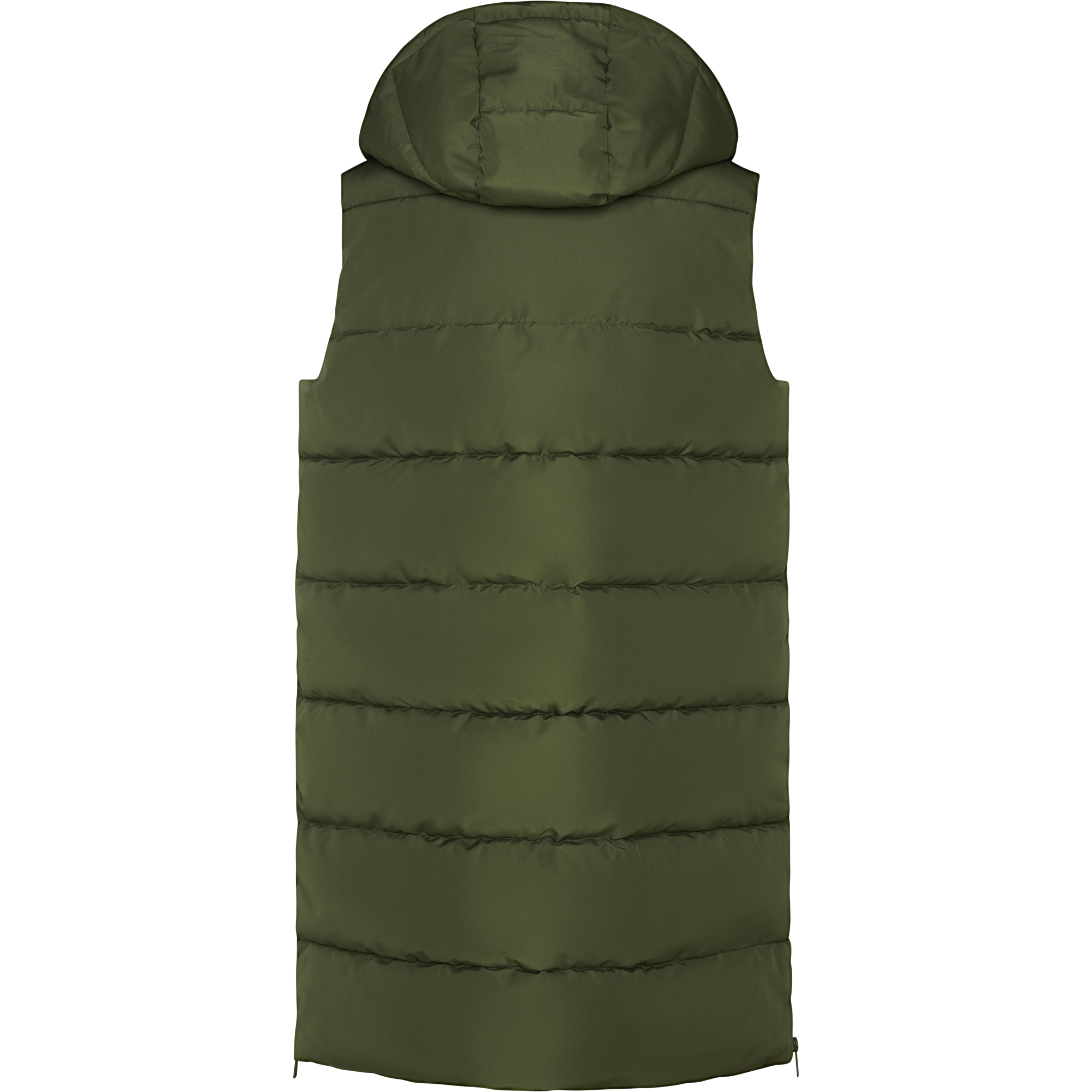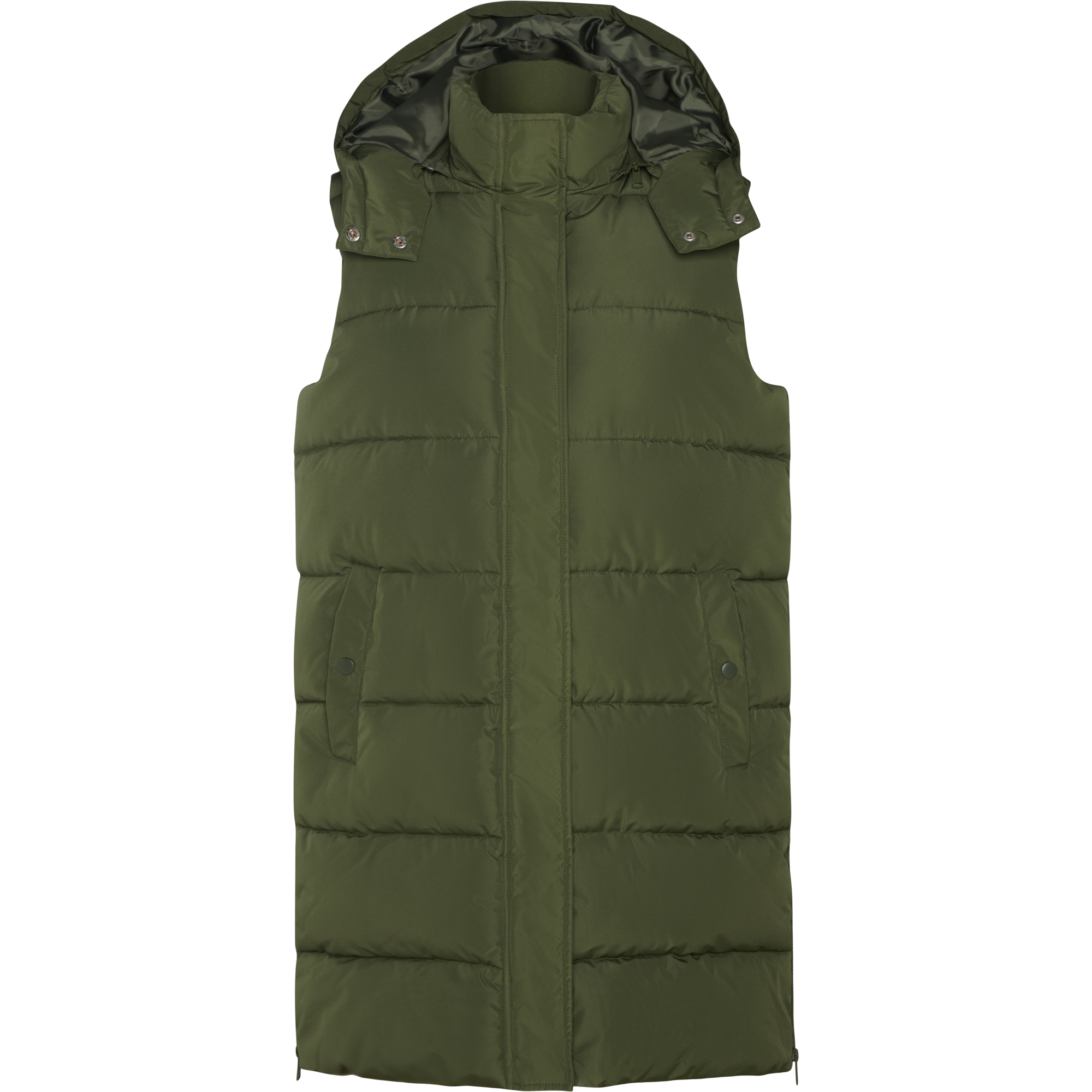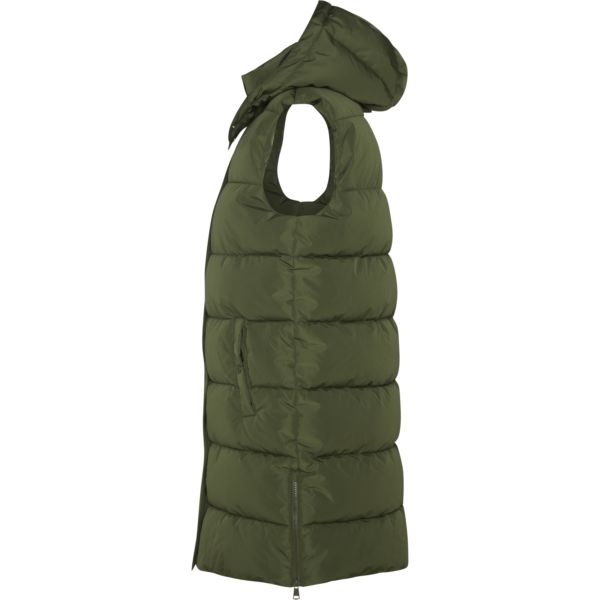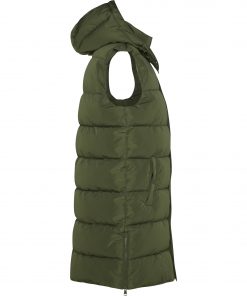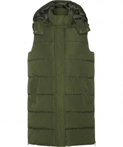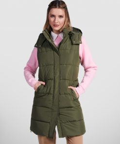 Chaleco acolchado de mujer con capucha extraíble. Cuello alto. Cierre frontal con cremallera oculta por solapa. Dos bolsillos con cierre de botón a presión. Aperturas laterales con cremalleras. Acceso interior en pecho para reprocesos.