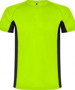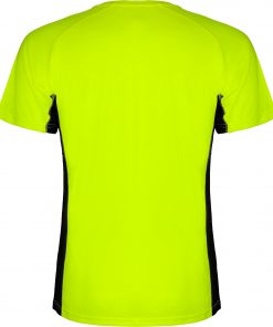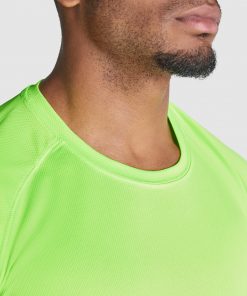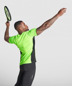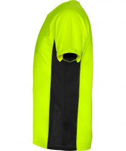 Camiseta técnica manga ranglan transpirable bicolor. Paneles laterales en tejido microperforado. Cuello redondo y cubrecosturas del mismo tejido al tono.