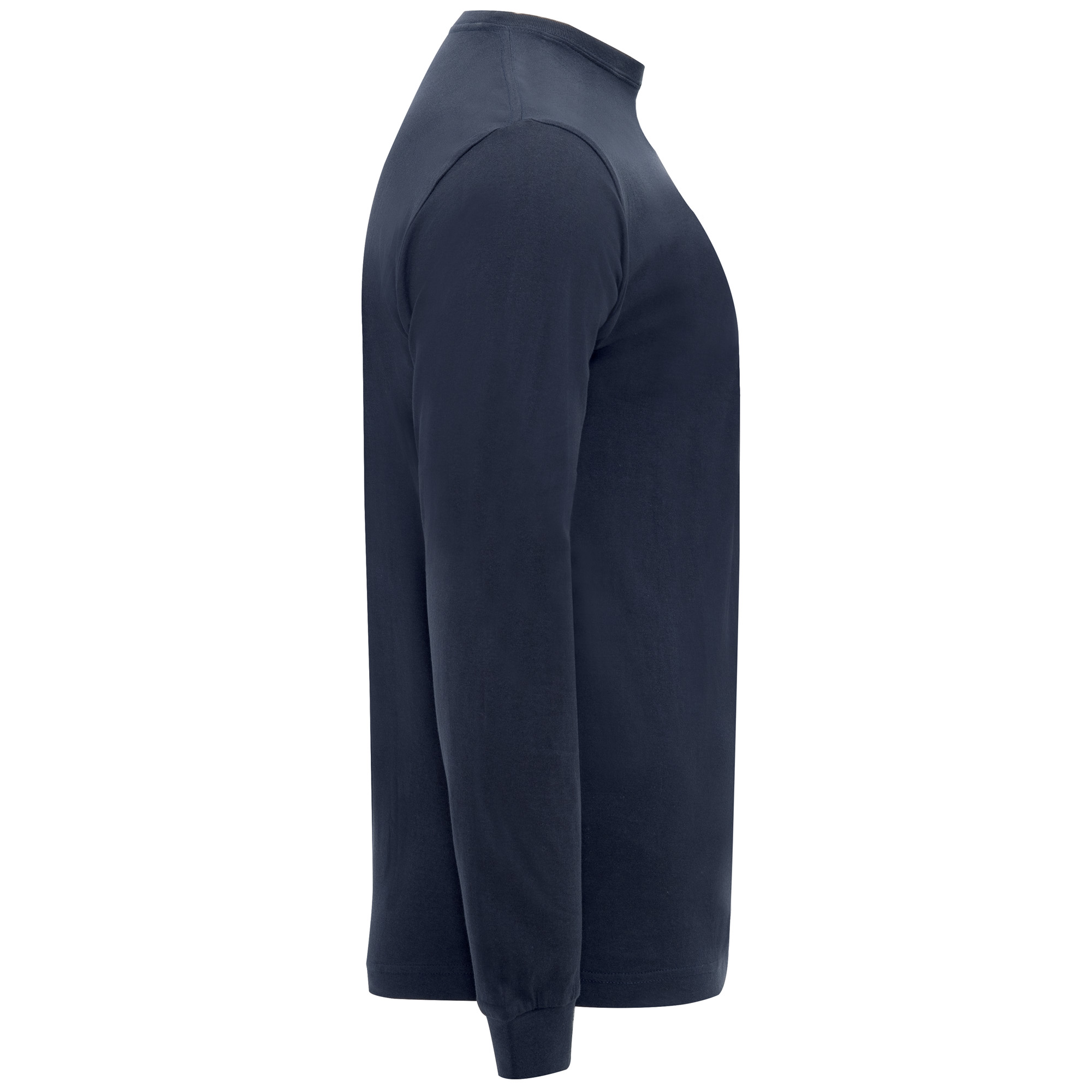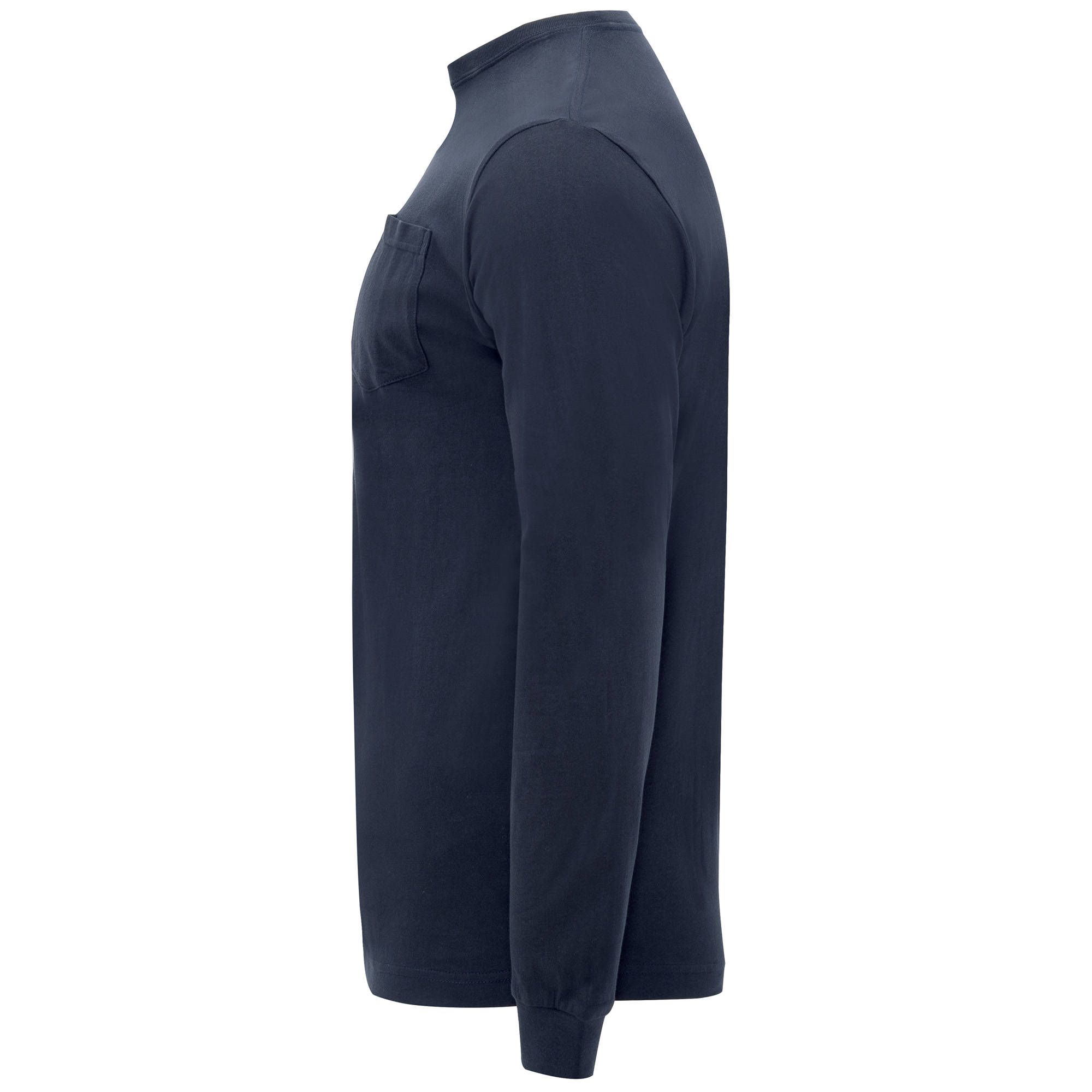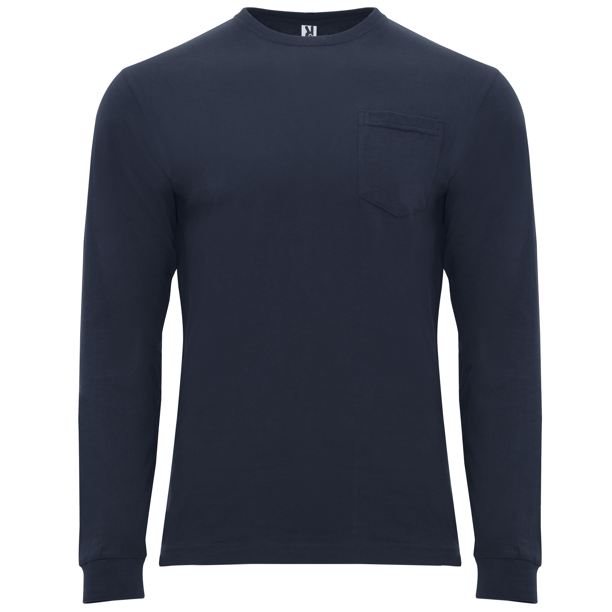 Camiseta de manga larga con costuras laterales. Cuello redondo y puños en canalé 1×1. Cubrecosturas en cuello del mismo tejido. Bolsillo en pecho izquierdo.