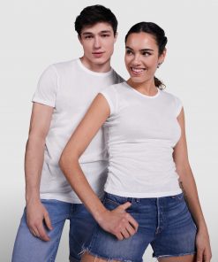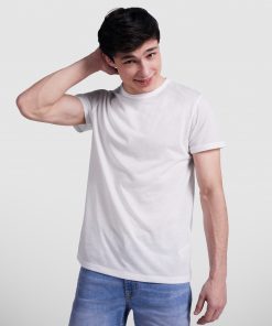 Camiseta de manga corta de poliéster tacto algodón con costuras laterales. Cuello redondo con ribete del mismo tejido