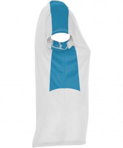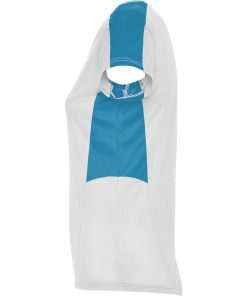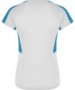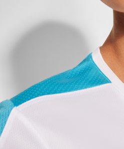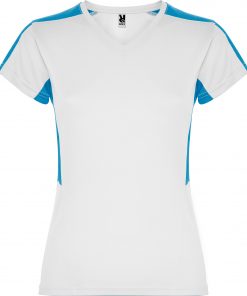 Camiseta técnica de manga corta para mujer con cuello pico. Combinada en laterales y hombros con dos tejidos de poliéster. Tejido principal bird´s eye y tejido rejilla 3D transpirable en hombros y paneles laterales. Tejido preparado para la absorción de humedad.