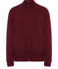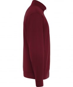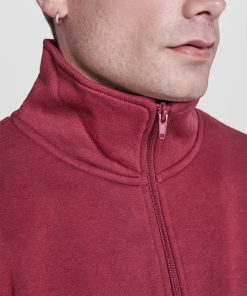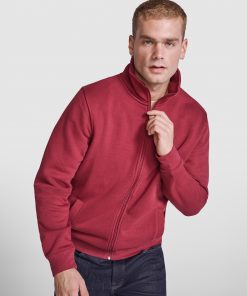 Sudadera unisex con cremallera frontal y cuello alto. Cremallera al tono. Dos bolsillos laterales con ribete del mismo tejido. Puños y cinturilla en canalé 2×1 con elastano. Cubrecosturas del mismo tejido.