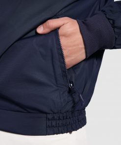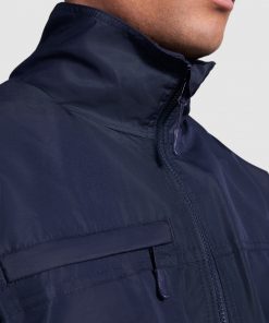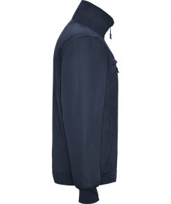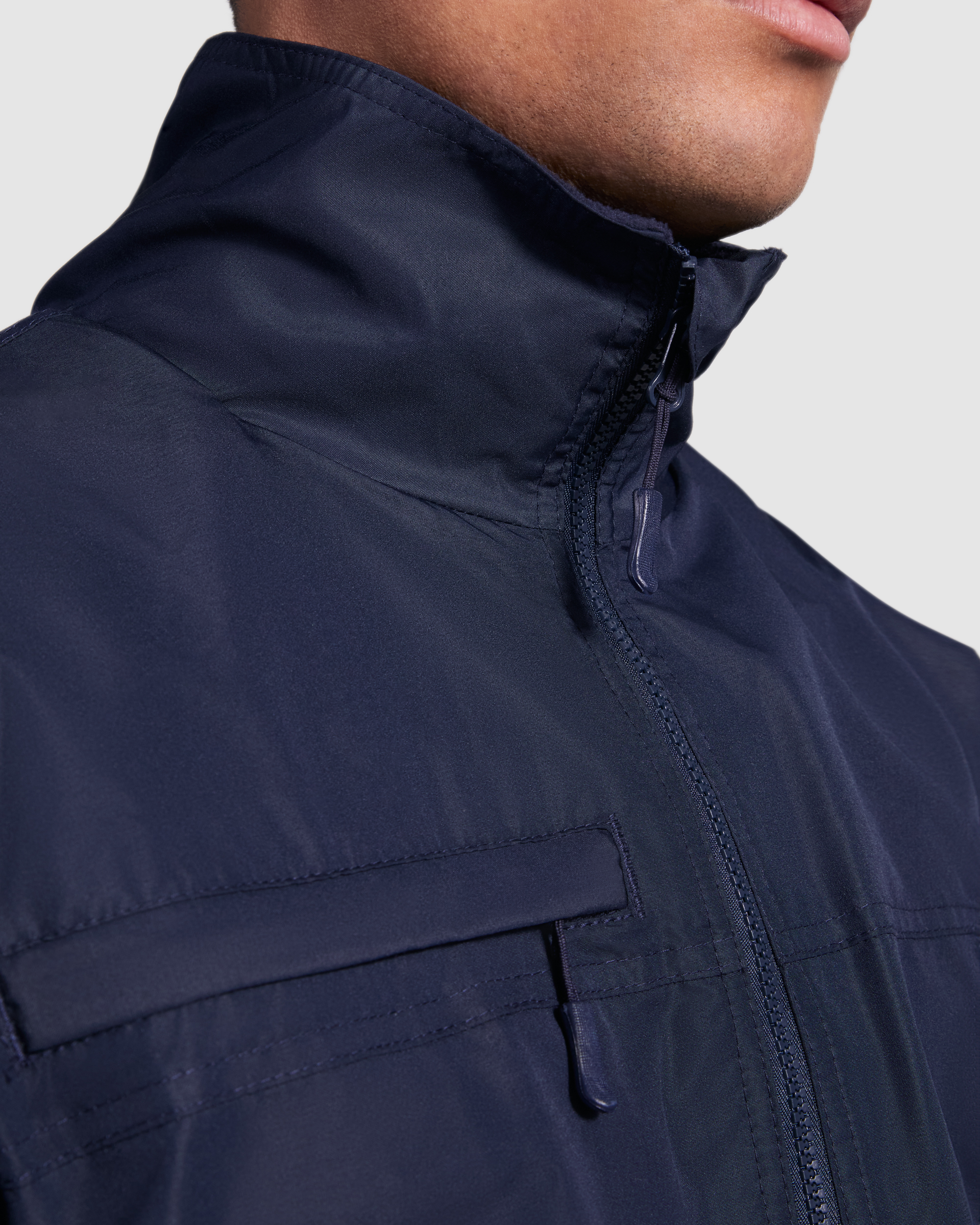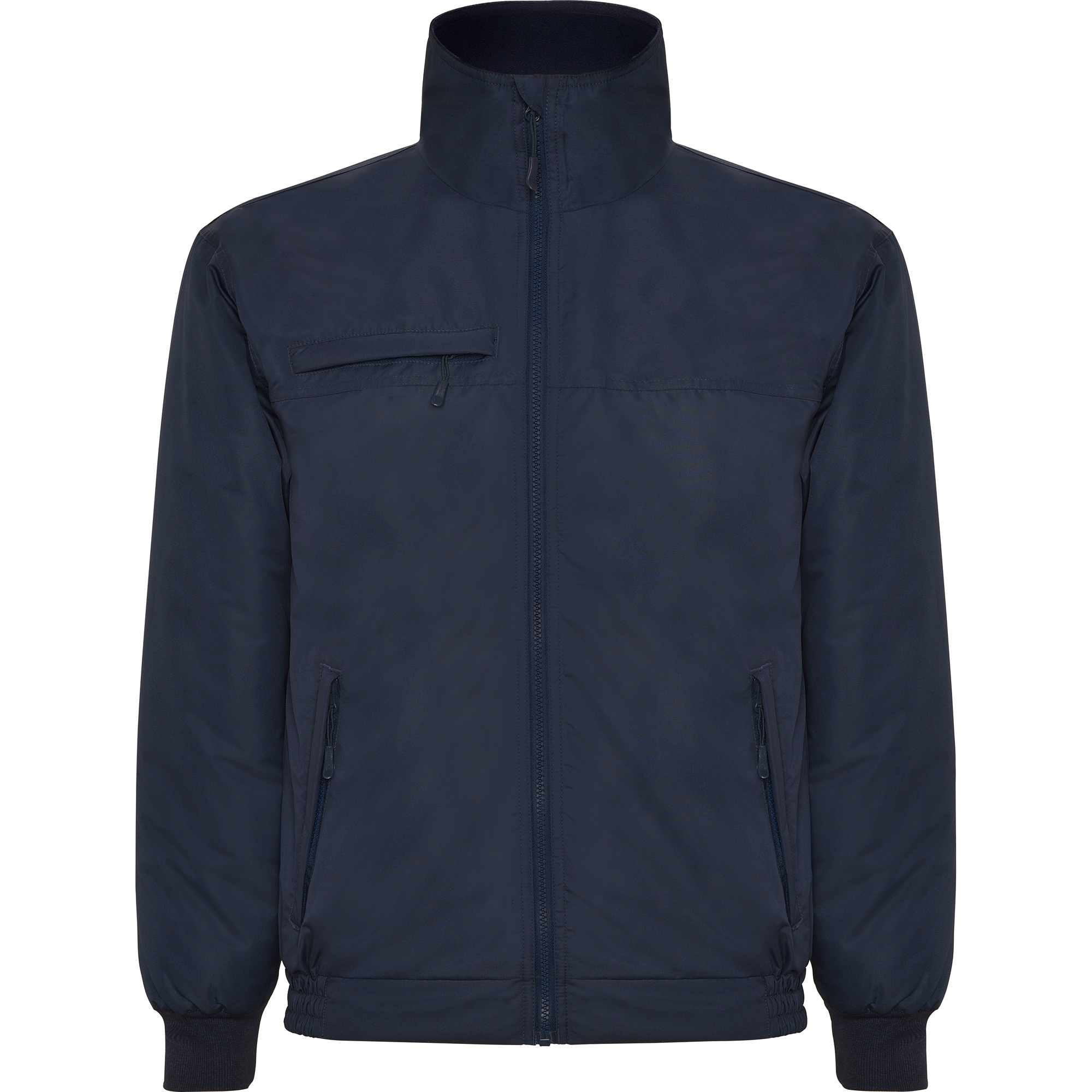 Chaqueta acolchada resistente al agua forrada en micropolar. Cremallera frontal al tono. Puños en canalé 1×1 y cintura engomada en los laterales. Bolsillos laterales y uno en pecho derecho con cremalleras al tono y cubiertos por una tapeta del mismo tejido. Acceso interior para reprocesos.